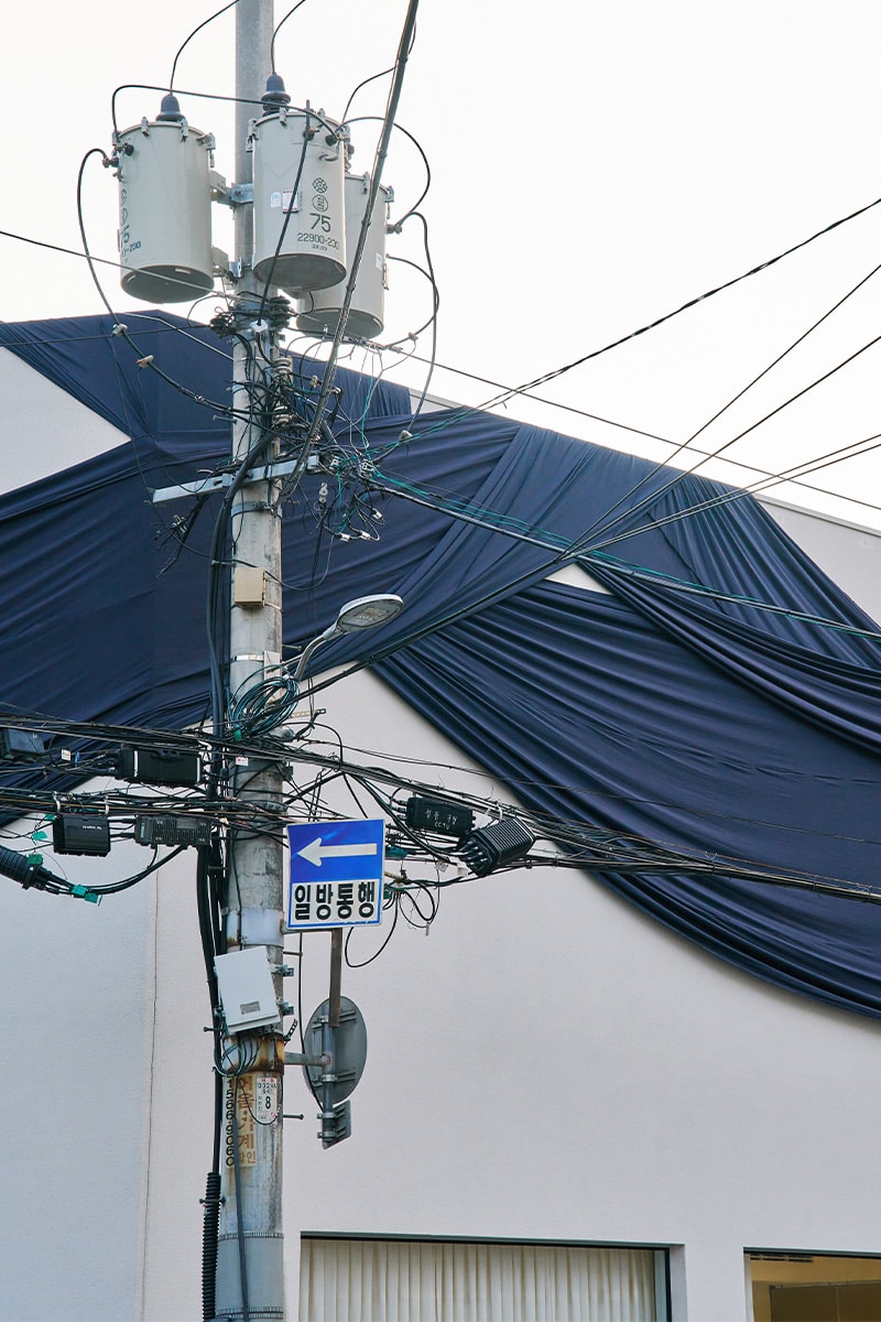 Южнокорейский дизайнер разместил масштабную текстильную инсталляцию на фасаде здания, чтобы проявить паттерн бренда при помощи солнца. Ткань постепенно выгорит от солнечных лучей и образует четкий рисунок с эффектом амбре.